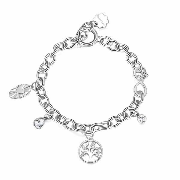 Ženska zapestnica iz nerjavečega jekla z obeski velikosti oc 0,5 cm do 1,3 cm.