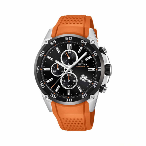 Mehanizem: Kronograf, Analogna Premer ure: 46mm Vodotesnost: 100m Material ohišja: Nerjaveče jeklo Material pasu: Guma Steklo: Mineralno Barva ohišja: Srebrna Barva pasu: Oranžna Barva številčnice: Črna