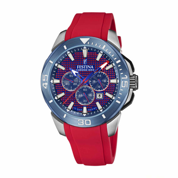 Mehanizem: Kvarčn, Analogna Premer ure: 47mm Vodotesnost: 100m Material ohišja: Nerjaveče jeklo Material pasu: Guma Barva ohišja: Srebrna Barva pasu: Rdeča Barva številčnice: Rdeča Steklo: Mineralno Kolekcija: CHRONO BIKE